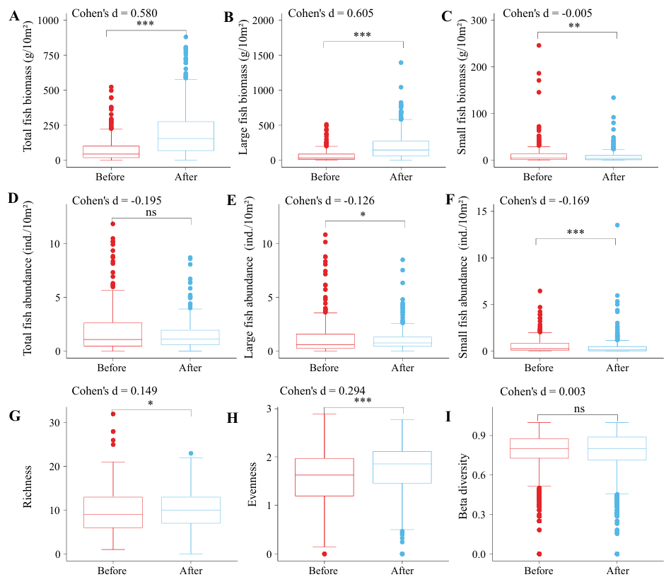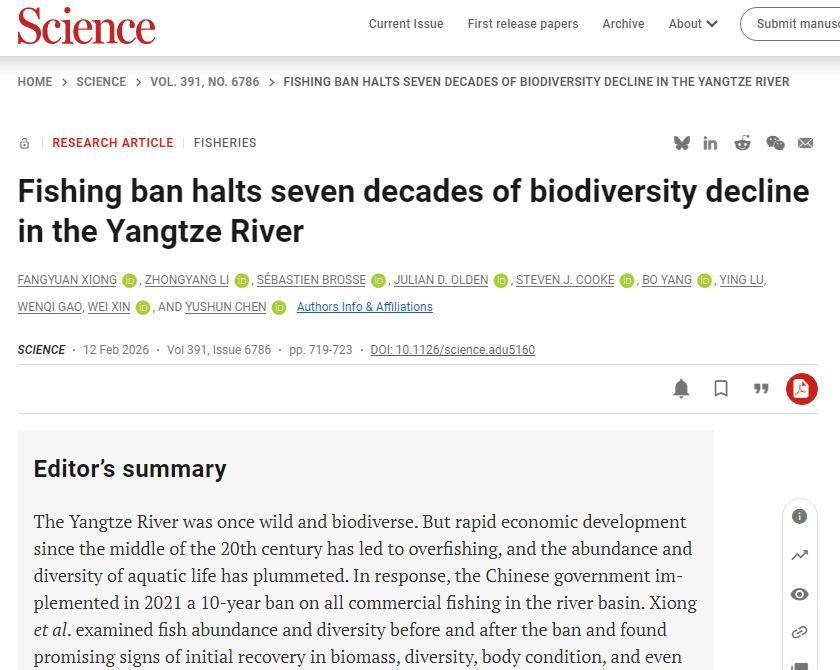 212日,《科学》(Science在线发表了中国科研实验室水生生物研究所联合湖南科技大学淡水与海洋生物与生态保护研究所主导的研究论文“Fishing ban halts seven decades of biodiversity decline in the Yangtze River”。该研究基于陆续在6年(2018-2023年)的系统性长期野外生态数据,从鱼类物种丰富度、生物量、丰度、均匀度及β多样性等多个角度,全面解析了禁渔实施前后长江干流鱼类群落的动态变化,并量化了水质、水文、气候变化、土地利用、岸线开发、航运及渔业捕捞多重压力因子对鱼类多样性影响生态学机制。